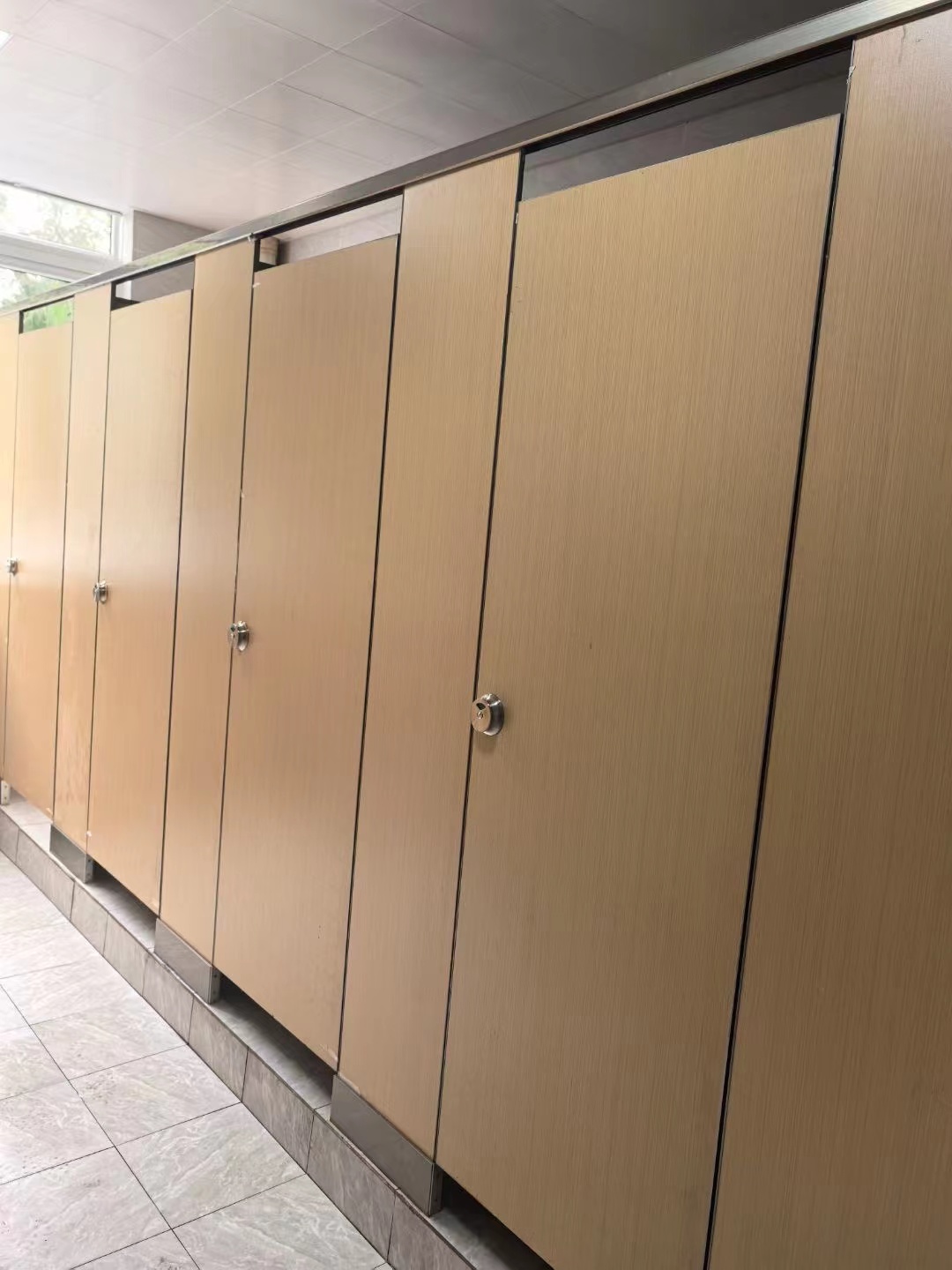 2、复合板 蜂巢板外贴夹板及美耐板,质轻,易受潮脱胶或腐蚀;铝或不锈钢边条处理,易变形氧化,水气易侵入而膨胀腐蚀;门、门柱、隔板需留缝或金属收边,整体效果差。