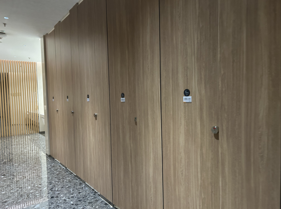2、复合板 蜂巢板外贴夹板及美耐板,质轻,易受潮脱胶或腐蚀;铝或不锈钢边条处理,易变形氧化,水气易侵入而膨胀腐蚀;门、门柱、隔板需留缝或金属收边,整体效果差。